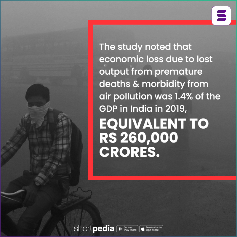 2. The study noted that economic loss due to lost output from premature deaths & morbidity from air pollution was 1.4% of the GDP in India in 2019, equivalent to Rs 260,000 crores.