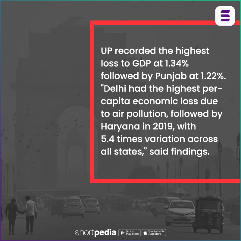 4. UP recorded the highest loss to GDP at 1.34% followed by Punjab at 1.22%. “Delhi had the highest per-capita economic loss due to air pollution, followed by Haryana in 2019, with 5.4 times variation across all states,” said findings.