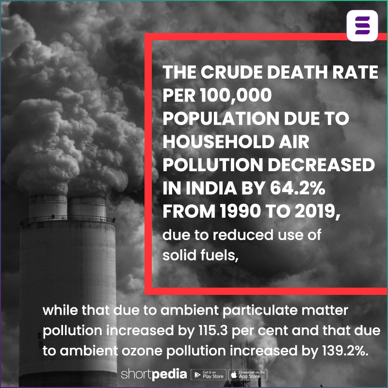 5. The crude death rate per 100,000 population due to household air pollution decreased in India by 64.2% from 1990 to 2019, due to reduced use of solid fuels, while that due to ambient particulate matter pollution increased by 115.3 per cent and that due to ambient ozone pollution increased by 139.2%.