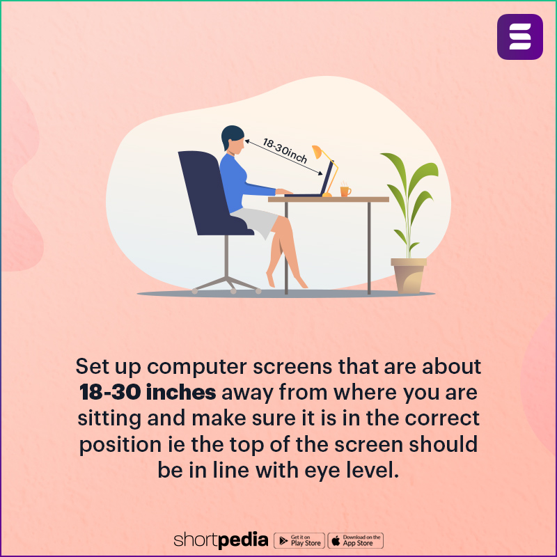 1. Set up computer screens that are about 18-30 inches away from where you are sitting and make sure it is in the correct position ie the top of the screen should be in line with eye level.