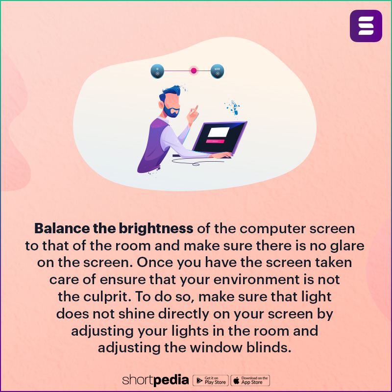2. Balance the brightness of the computer screen to that of the room and make sure there is no glare on the screen. Once you have the screen taken care of ensure that your environment is not the culprit. To do so, make sure that light does not shine directly on your screen by adjusting your lights in the room and adjusting the window blinds.