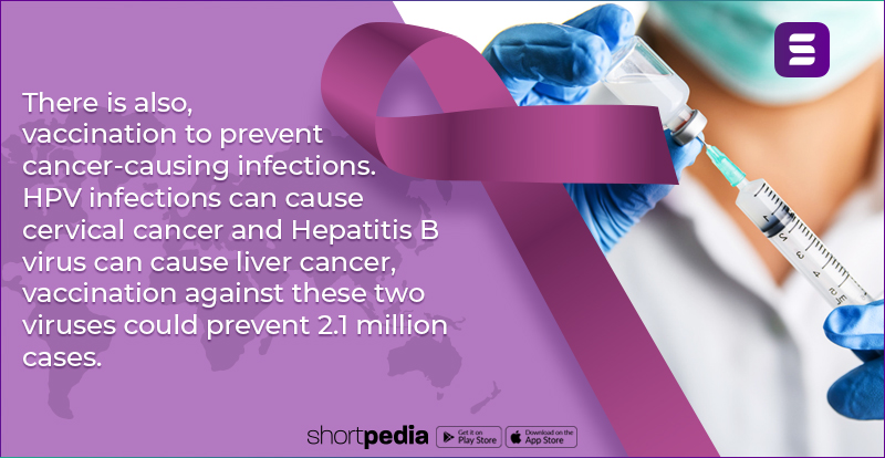 4) There is also, vaccination to prevent cancer-causing infections. HPV infections can cause cervical cancer and Hepatitis B virus can cause liver cancer, vaccination against these two viruses could prevent 2.1 million cases.