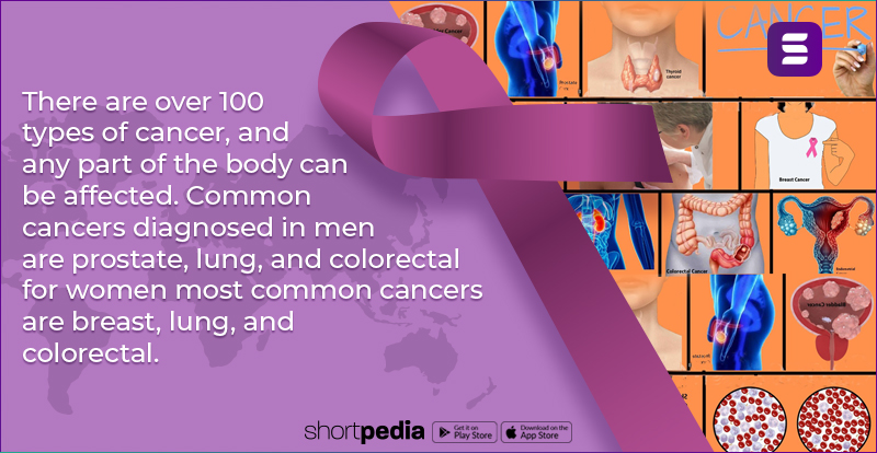 5) There are over 100 types of cancer, and any part of the body can be affected. Common cancers diagnosed in men are prostate, lung, and colorectal for women most common cancers are breast, lung, and colorectal.