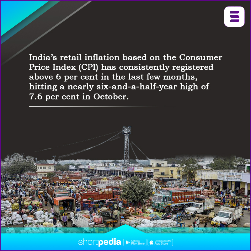 1. India’s retail inflation based on the Consumer Price Index (CPI) has consistently registered above 6 per cent in the last few months, hitting a nearly six-and-a-half-year high of 7.6 per cent in October.