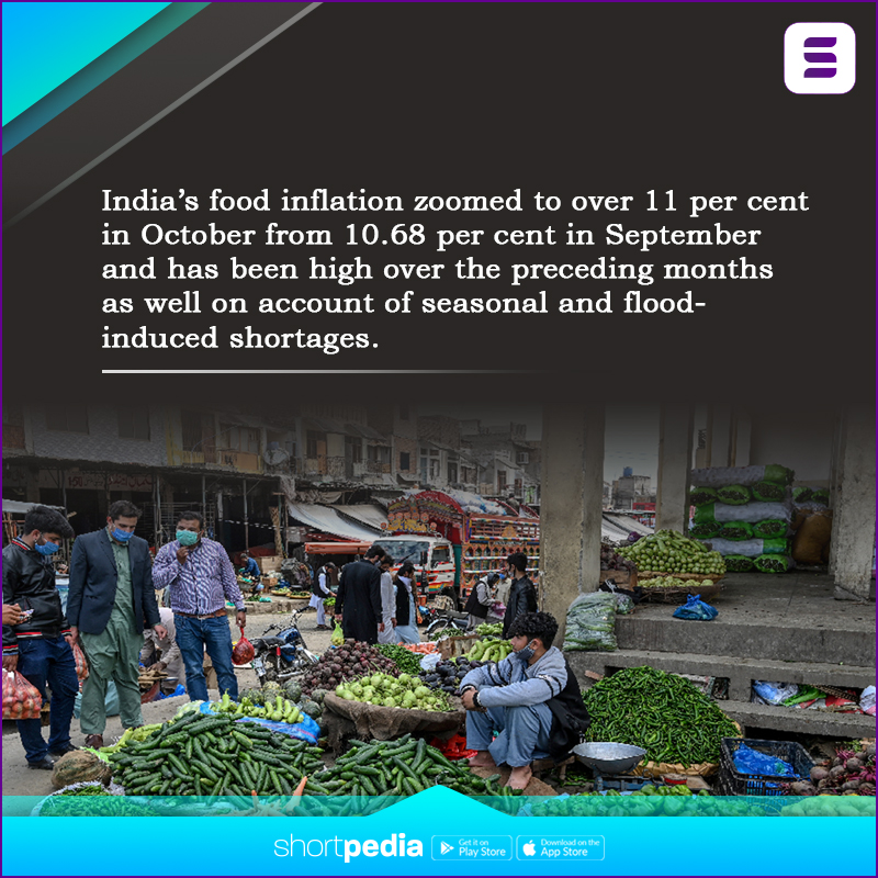 5. India’s food inflation zoomed to over 11 per cent in October from 10.68 per cent in September and has been high over the preceding months as well on account of seasonal and flood-induced shortages.