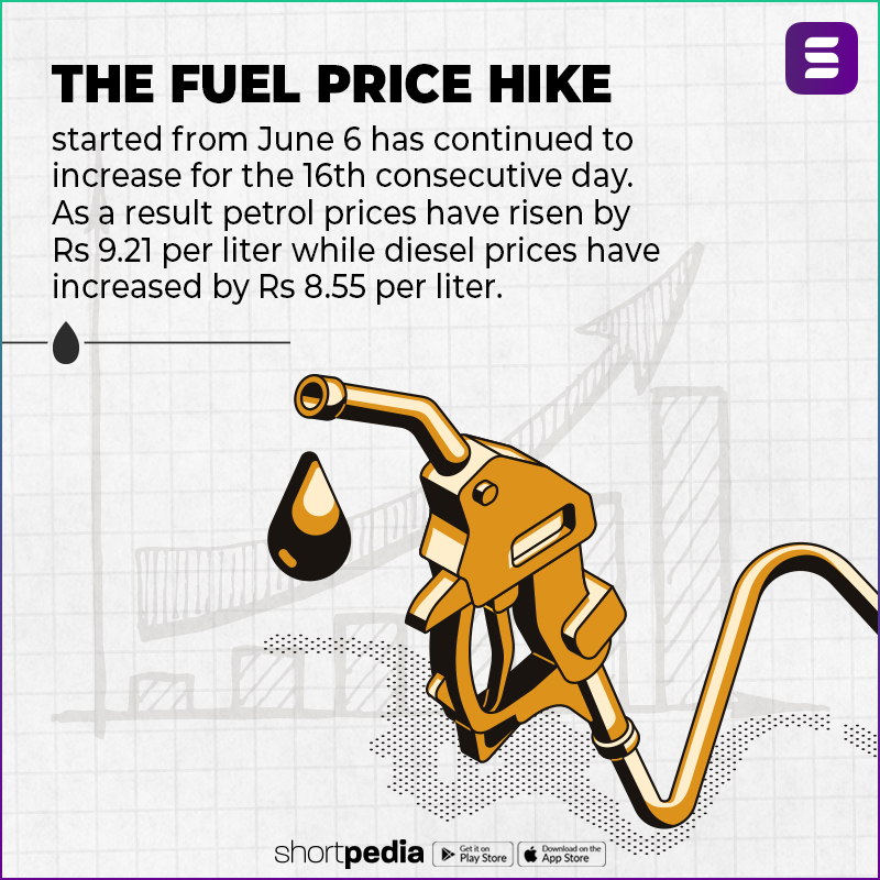 1. The fuel price hike started from June 6 has continued to increase for the 16th consecutive day. As result petrol prices have risen by Rs 9.21 per liter while diesel prices have increased by Rs 8.55 per liter.