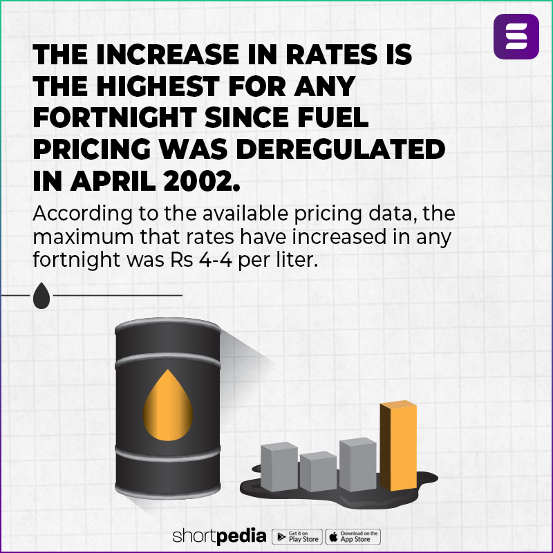 2. The increase in rates is the highest for any fortnight since fuel pricing was deregulated in April 2002. According to the available pricing data, the maximum that rates have increased in any fortnight was Rs 4-4 per liter.