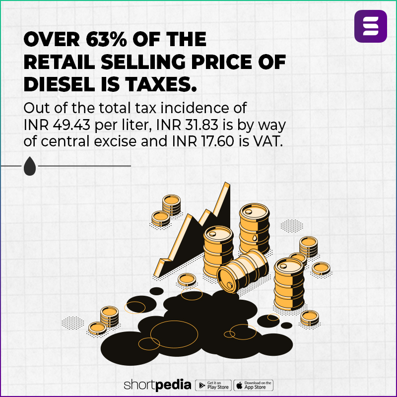 3. Over 63% of the retail selling price of diesel is taxes. Out of the total tax incidence of INR 49.43 per liter, INR 31.83 is by way of central excise and INR 17.60 is VAT.