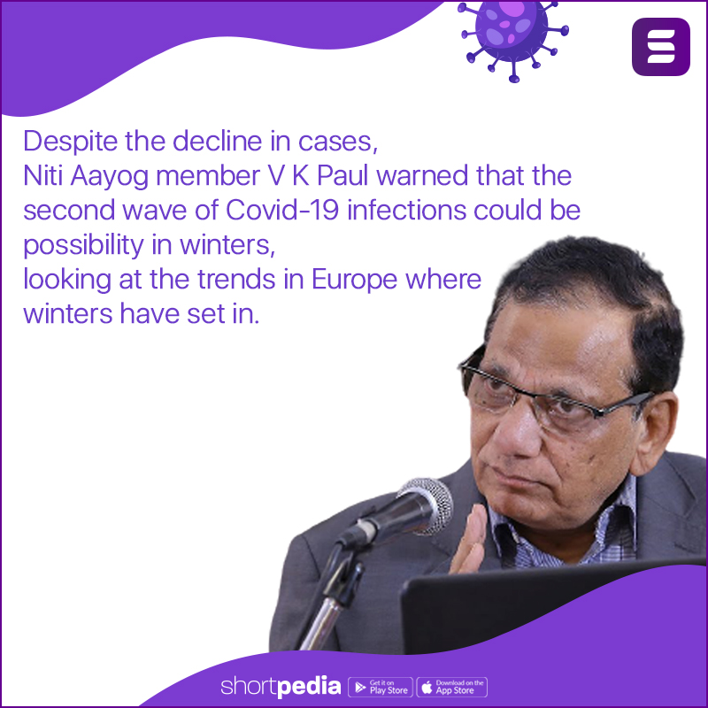 5. Despite the decline in cases, Niti Aayog member V K Paul warned that the second wave of Covid-19 infections could be a possibility in winters, looking at the trends in Europe where winters have set in.