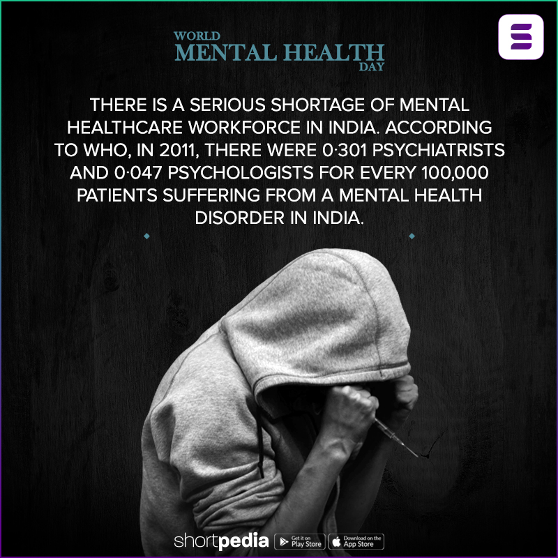 5. There is a serious shortage of mental healthcare workforce in India. According to WHO, in 2011, there were 0·301 psychiatrists and 0·047 psychologists for every 100,000 patients suffering from a mental health disorder in India.