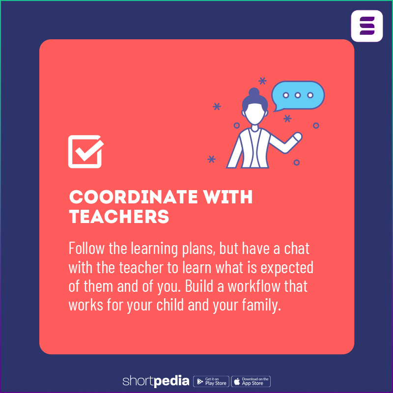 Follow the learning plans, but have a chat with the teacher to learn what is expected of them and of you. Build a workflow that works for your child and your family.