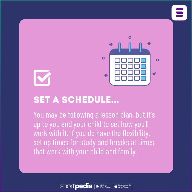 You may be following a lesson plan, but it’s up to you and your child to set how you’ll work with it. If you do have the flexibility, set up times for study and breaks at times that work with your child and family.