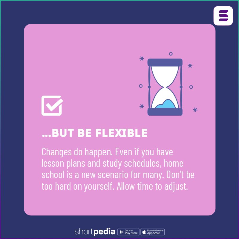 Changes do happen. Even if you have lesson plans and study schedules, home school is a new scenario for many. Don’t be too hard on yourself. Allow time to adjust.
