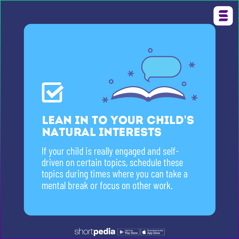 If your child is really engaged and self-driven on certain topics, schedule these topics during times where you can take a mental break or focus on other work.