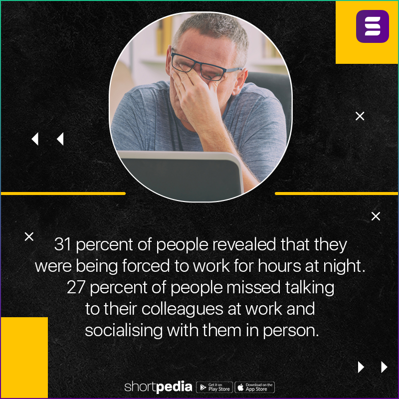 6. 31 percent of people revealed that they were being forced to work for hours at night. 27 percent of people missed talking to their colleagues at work and socializing with them in person.