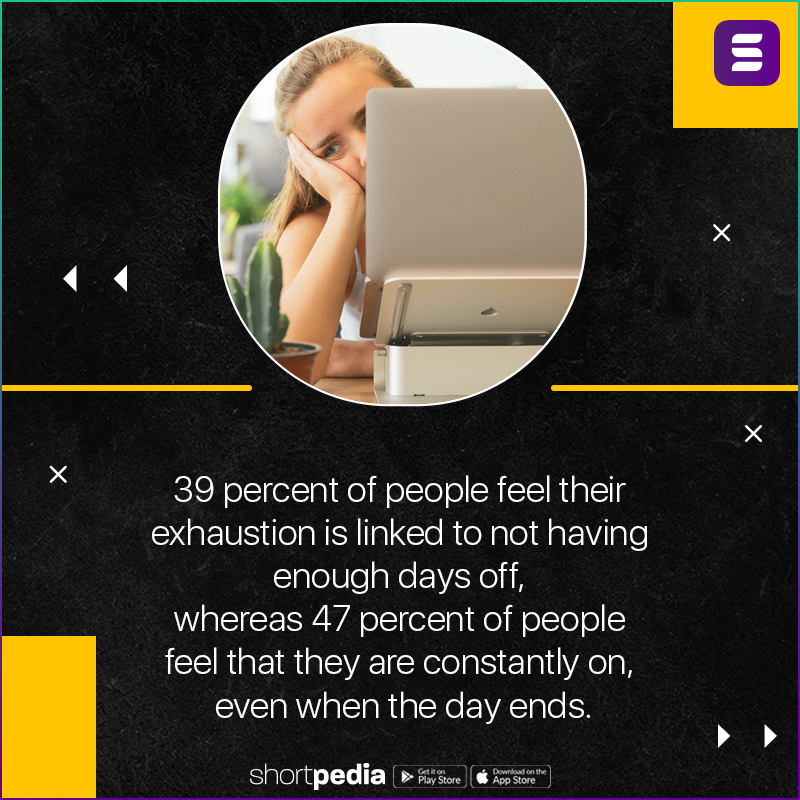 7. 39 percent of people feel their exhaustion is linked to not having enough days off, whereas 47 percent of people feel that they are constantly on, even when the day ends.
