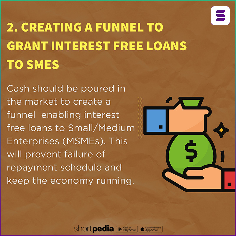 cash should be poured in the market to create a funnel enabling interest-free loans to Small/Medium Enterprises (MSMEs). This will prevent the failure of the repayment schedule and keep the economy running.