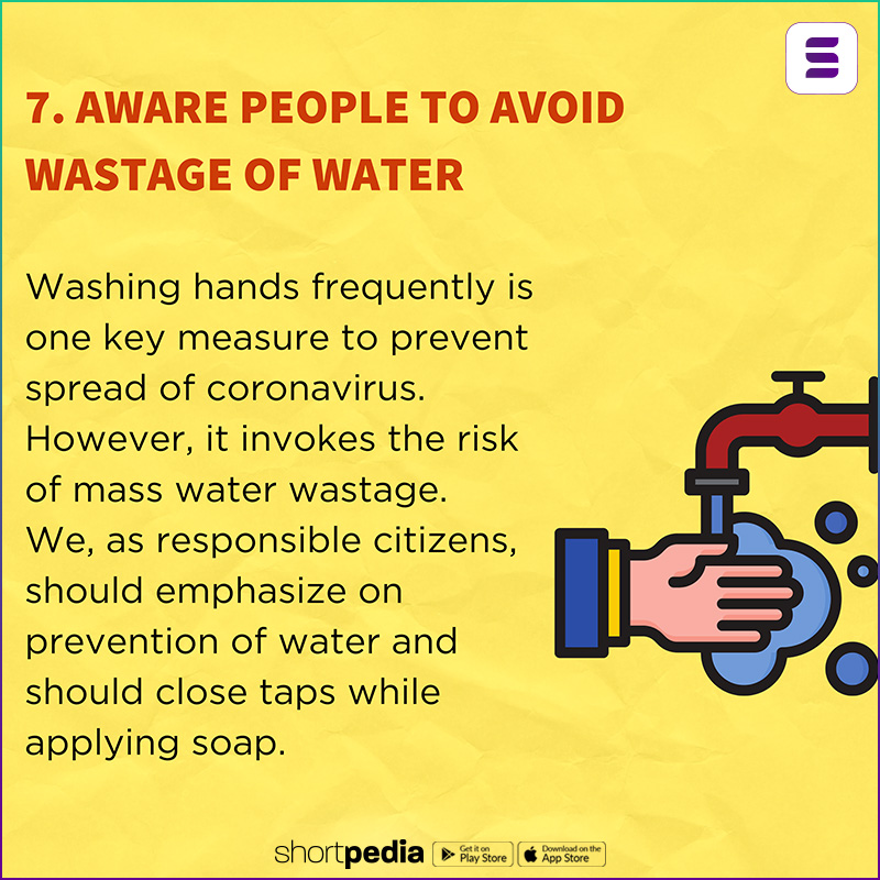 Washing hands frequently is one key measure to prevent spread of coronavirus. However, it invokes the risk of mass water wastage. We, as responsible citizens, should emphasize on prevention of water and should close taps while applying soap.