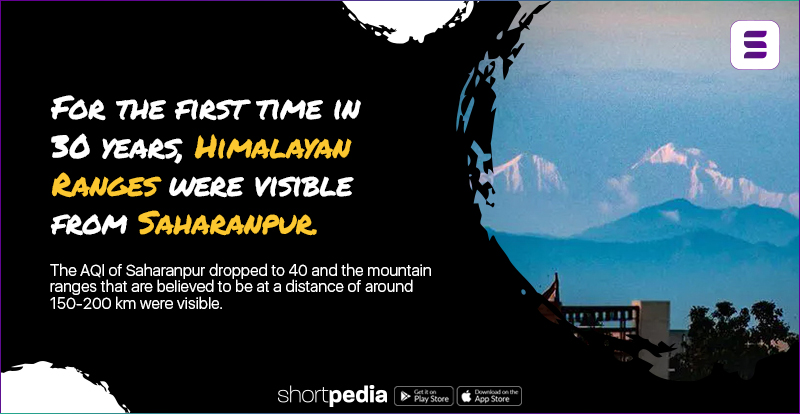 For the first time in 30 years, Himalayan Ranges were visible from Saharanpur. The AQI of Saharanpur dropped to 40 and the mountain ranges that are believed to be at a distance of around 150-200 km were visible.