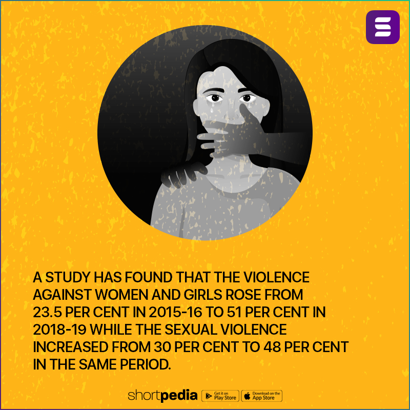 1. A study has found that the violence against women and girls rose from 23.5 per cent in 2015-16 to 51 per cent in 2018-19 while the sexual violence increased from 30 per cent to 48 per cent in the same period.