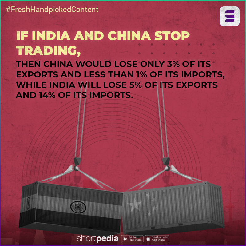 4. If India and China stop trading, then China would lose only 3% of its exports and less than 1% of its imports, while India will lose 5% of its exports and 14% of its imports.