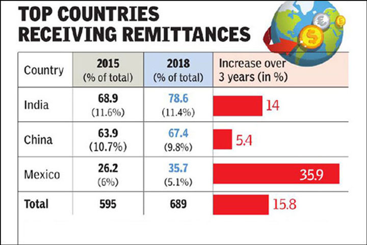 India retained its position as the world's top recipient of remittances, with its diaspora sending back $78.6 billion in 2018. India's diaspora is the largest in the world, at 17.5 million and its remittances were 14% of the global remittance figure of $689 billion. China stood second in the list with remittances of $67.41 billion. India was the top recipient of remittances in 2010 and 2015 as well.