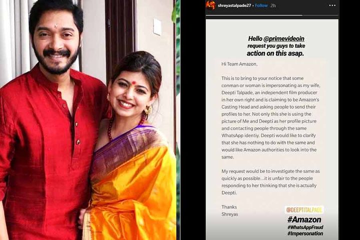 Actor turned director Shreyas Talpade has requested people to not to get duped by an impersonator who is using his wife Deepti's name and photo and posing as the casting head of Amazon. He said that they found it out when a friend sent them a screenshot. He wrote a letter to Amazon requesting them to investigate the matter so that people don't get cheated by this person. He said that the whole incident is disturbing.