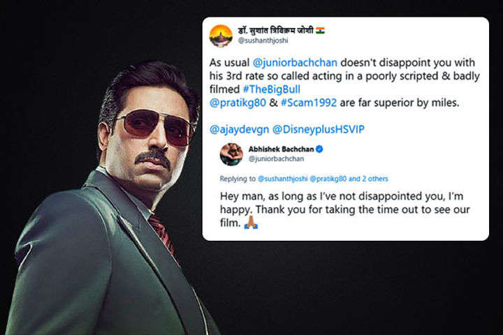 Abhishek Bachchan’s much-awaited movie The Big Bull released yesterday. A Twitter user described his ‘so-called acting’ as ‘third rate’. One person commented, “As usual @juniorbachchan doesn’t disappoint you with his 3rd rate so called acting in a poorly scripted & badly filmed #TheBigBull. Abhishek responded, “Hey man, as long as I’ve not disappointed you, I’m happy. Thank you for taking the time out to see our film.”