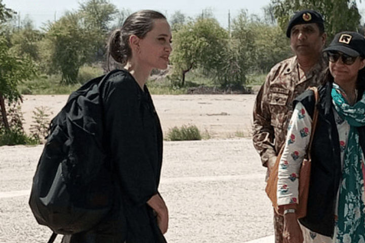 Amidst outpouring of international support and sympathy for flood-hit Pakistan, Hollywood actress and UN humanitarian Angelina Jolie visited Dadu on Tuesday. Several photos and videos showed Angelina arriving at an airport in Karachi. According to media reports, she visited some of the flood-affected areas and expressed solidarity with the flood victims.