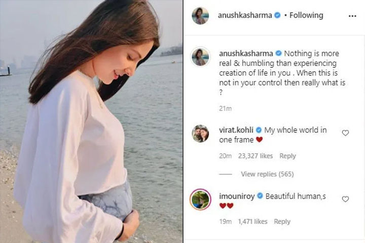 Bollywood actress and mum-to-be Anushka Sharma shared a picture of her baby bump on social media and said that nothing is more real and humbling than experiencing creation of life in you. Anushka shared the picture on Instagram, where she is seen standing at the beach. She is lovingly looking at her bump as she has her hand over it. Her husband and star cricketer Virat Kohli commented: "My whole world in one frame."
