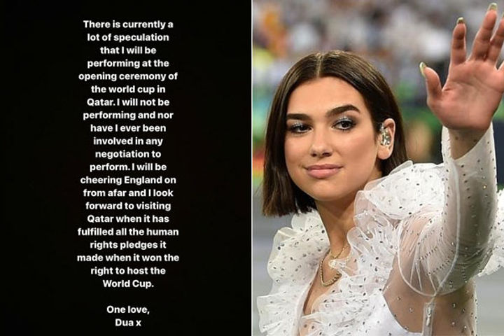 Putting an end to all speculation, British singer and songwriter Dua Lipa has revealed that she will not be performing at the 2022 FIFA World Cup, set to commence in Qatar on November 20. According to Variety, denying rumours of her involvement and calling for the host nation to address its human rights abuses, Dua shared a statement on her Instagram Story on Sunday.