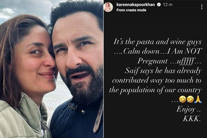Kareena Kapoor Khan took to Instagram story and quashed rumours about being pregnant again with hubby Saif Ali Khan. She took a hilarious dig to stop the buzz. Taking to her Instagram story she wrote, "It's the pasta and wine guys ..Calm down ... I Am NOT Pregnant ... ufffff ... Saif says he has already contributed way too much to the population of our country. Enjoy .. KKK."