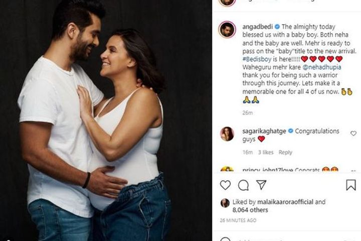 Celebrity couple Neha Dhupia and Angad Bedi have been blessed with a baby boy on Sunday. Angad announced the good news through a social media post. Taking to his Instagram handle, Angad shared a picture of him and Neha from a pregnancy photoshoot where the two are seen wearing classic white-and-blue outfits. Along with the photo, Angad announced the news and shared that both the mother and the baby are healthy.