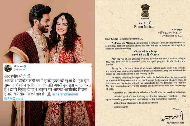 Prime Minister Narendra Modi congratulated newlyweds Palak Muchhal and Mithoon. The singers tied the knot in the presence of their close friends and family members on November 6 in Mumbai. On Tuesday, Mithoon and Palak took to their official Twitter accounts and thanked the PM for his wishes. They also shared a picture of the letter.