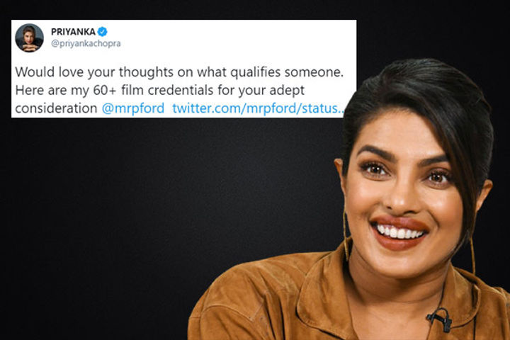 Priyanka Chopra and Nick Jonas virtually announced the Oscars 2021 nominations recently. Days after, an Australian journalist named Peter Ford questioned their credentials in making the big announcement. Giving him a befitting reply, Priyanka sent out a list of her movie credentials with a tweet reading: Would love your thoughts on what qualifies someone. Here are my 60+ film credentials for your adept consideration.