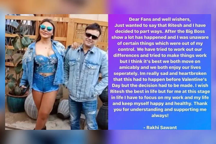 Entertainment queen Rakhi Sawant has left fans in disbelief with her recent Instagram post as she announced that she and Ritesh Singh have decided to split and part ways. Ritesh Singh had entered Bigg Boss 15 last year as Rakhi Sawant's husband. The duo took part in the show as a couple. Later, they were also seen together at Shamita Shetty's birthday a few weeks ago.