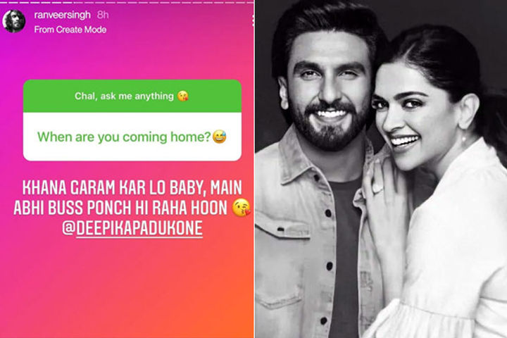 Ranveer Singh recently conducted an Ask Me Anything session for his fans. His wife Deepika Padukone was amongst the many people who dropped a message for the actor. She asked him when is he coming home and his answer is winning everyone's heart. Khana garam kar lo baby, main abhi buss ponch hi raha hoon, Ranveer replied. He also gave answers to other questions. He revealed that 'Rambo' is his nickname.