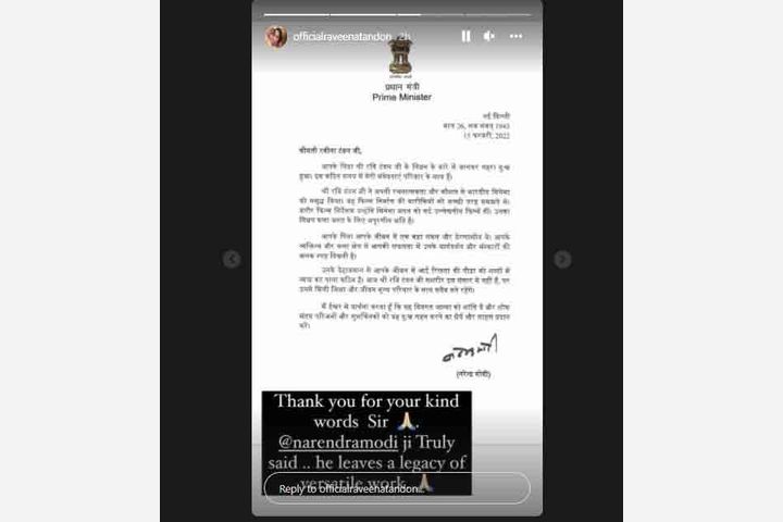 Bollywood actor Raveena Tandon on Thursday shared Prime Minister Narendra Modi's condolence letter for her filmmaker father Ravi Tandon, who passed away earlier this month. In the letter, the prime minister offered his condolences to the family and said he was saddened by Ravi Tandon's demise. Raveena Tandon expressed gratitude towards the prime minister and wrote, 'Thank you for your kind words Sir.