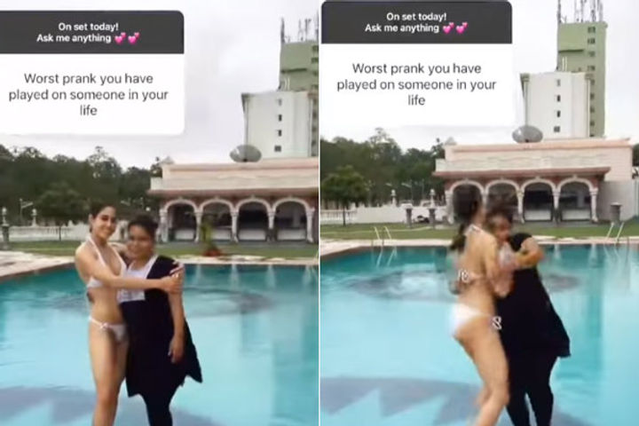 Bollywood's generation-next star Sara Ali Khan recently had a 'Ask Me Anything' session while being on the sets. One of the fans asked her about the worst prank she's played on someone and guess what? Sara Ali Khan dropped a video of hers with spot girl Jharu, whom she tricked into posing for a picture and later pushed her into the pool. The actress also joined her later for a swim.