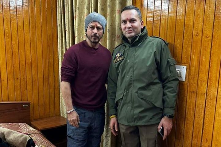 Bollywood superstar Shah Rukh Khan's pictures, sporting a teeka on forehead after seeking blessings at Vaishno Devi Temple have gone viral on social media. In the photos, Shah Rukh can be seen posing with a fan. Several users have shared the pics on social media. The Pathaan actor was also spotted at the airport after his visit to the temple. In the now-viral photos, he can be seen with his manager Pooja Dadlani.