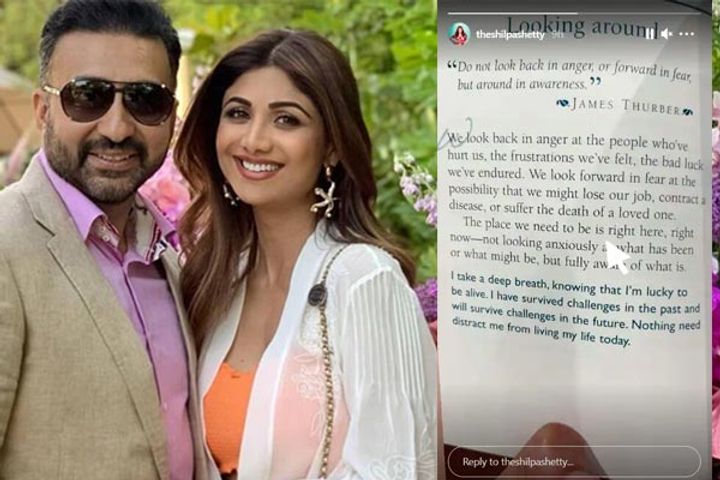 Days after husband Raj Kundra was arrested by the Crime Branch of Mumbai Police, actress wife Shilpa Shetty has finally broken her silence on social media. Shilpa Shetty's first post on Instagram after his arrest talks about surviving challenges. She put up a screenshot from a book on her IG story, reading: Do not look back in anger, nor forward in fear, but around in awareness. James Thurber