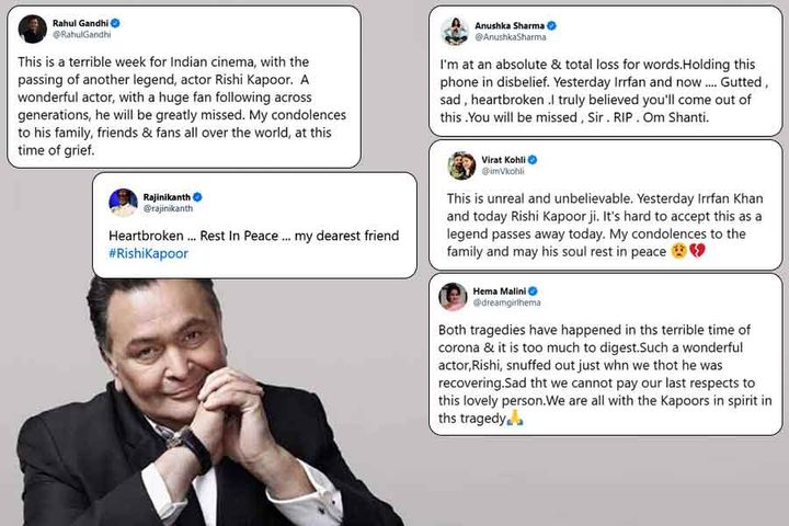 Bollywood stars, sports personalities, politicians and common people, everyone woke up to the shocking news of actor Rishi Kapoor's demise today. Several personalities including Hema Malini, Rahul Gandhi, Anushka Sharma, Virat Kohli, Kamal Haasan, Farhan Akhtar and Shashi Tharoor mourned the veteran actor's death. "This is terrible week for Indian cinema," said Rahul Gandhi. Anushka Sharma said she was in "total loss of words".