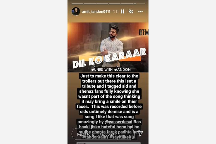 Singer Amit Tandon recently announced his upcoming song titled 'Dil Ko Karaar' on social media and had added hashtags of Shehnaaz Gill and late actor Sidharth Shukla in his post. Soon after his post, he faced backlash on Twitter. The singer, on Saturday, clarified that the song wasn't a tribute to Sidharth Shukla and had been recorded before his death.