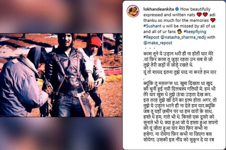 Actress Ankita Lokhande, who is Sushant Singh Rajput's ex-girlfriend, shared a heartwarming video of the late star enjoying paragliding during one of their old trips. Along with the post, Ankita dedicated a note to Sushant and said, "You will be missed by all of us and all of your fans. Keep flying." The clip was initially shared by TV actress Natasha Sharma, who is a close friend of Ankita.