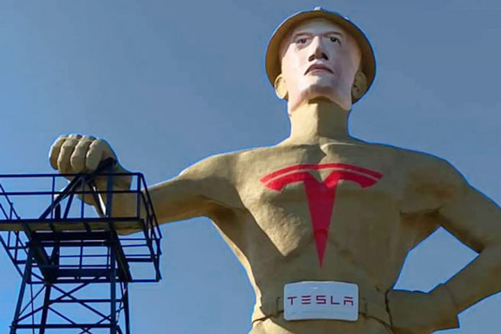 The city of Tulsa, Oklahoma gave its landmark Golden Driller statue a makeover to look like Elon Musk in a bid for Tesla's next factory. The 75-foot tall statue originally erected as a tribute to the city's drilling history was transformed to look like Musk, complete with a new face, Tesla logo, and a Tesla beltbuckle, where "Tulsa" used to be. Tulsa is on the short list for Tesla's next factory, along with Austin, Texas.