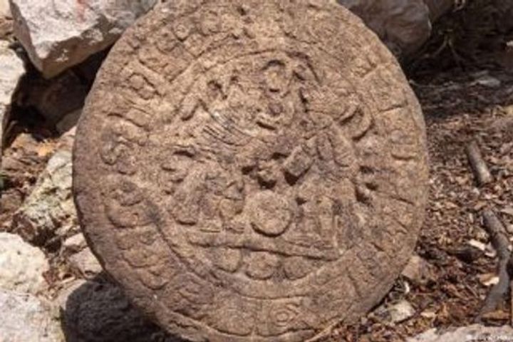 The piece displays Mayan hieroglyphic writing surrounding two players standing next to a ball. The Pok Ta Pok ball game was a traditional practice of Mesoamerican peoples.An apparent stone scoreboard has been discovered at the Chichen Itza archaeological site in southeastern Mexico, archaeologists have said. The piece measures just over 32 cm (12.6 inches) in diameter and weighs 40 kilos (around 90 pounds). It dates from between 800 and 900 AD.