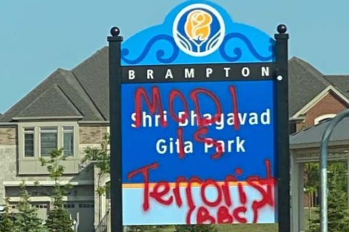 Some unidentified miscreants allegedly damaged the signboard of Shri Bhagavad Gita Park in Brampton, Canada, and defaced it with graffiti attacking Prime Minister Narendra Modi, eliciting outrage from the Indian diaspora there. The graffiti on the park signage allegedly read "Modi is Terrorist (BBC)," which was later removed by city workers. Authorities in Canada condemned the incident and assured action against the perpetrators.