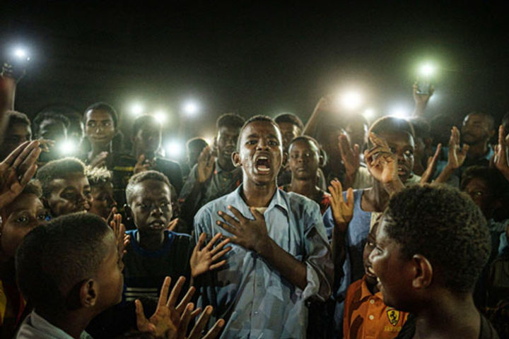 An image from last year's uprising in Sudan after Longtime ruler Omar al-Bashir was overthrown won the World Press Photo of the Year Award. The photo, titled Straight Voice was taken by AFP photographer Yasuyoshi Chiba showing the power of youth and art. In the photo, you can see a demonstrator reciting protest poetry, while a crowd of fellow protesters beautifully illuminate him with the light from their phones.