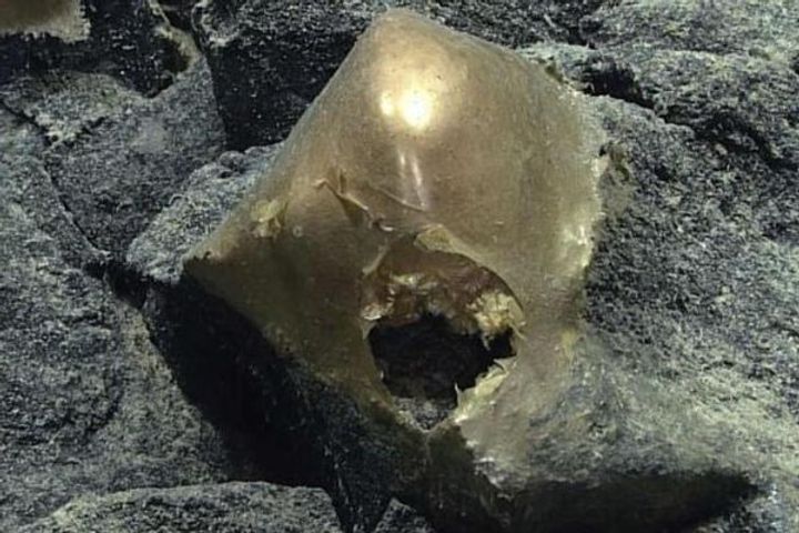 A remotely operated underwater vehicle, belonging to NOAA Ocean Exploration, discovered a puzzling golden orb at a depth of 3,300 meters off Alaska's coast. The orb, measuring around 10 centimeters across, was "tightly adhered" to a rock with white sponges. Initial speculations included that it could be an egg casing from an unknown species, a coral, or a dead sponge. However, DNA studies will be conducted to determine the organism responsible for the creation of the mysterious orb.