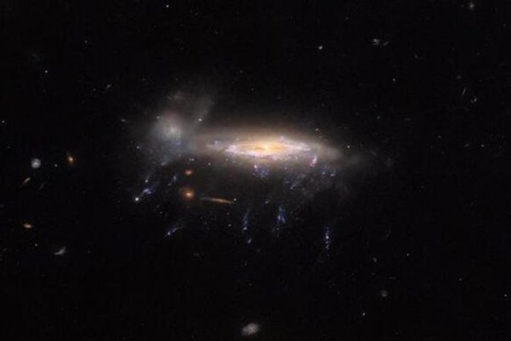 NASA's Hubble Space Telescope has captured an intriguing 'jellyfish galaxy.' It has been so named because of the bright strings of gas that are similar to "floating jellyfish tentacles" and can be seen trailing down from the central bright core of the galaxy. Dubbed JO204, the cosmic object is located in the constellation Sextans, about 600 million light-years from the Earth.